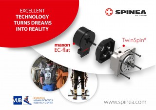 The BRUBOTICS robotics research group of the Vrije Universiteit Brussel (VUB) in Brussels approached SPINEA, s.r.o. with an innovative exoskeleton project in which an extremely ultra-light and efficient actuator is required that goes beyond the capabilities of commonly available current technologies. Combining the Maxon EC-flat motor with the new TwinSpin® 50 M-series gearbox from SPINEA® resulted in a compact and lightweight actuator (650 g) with excellent efficiency even under part load.